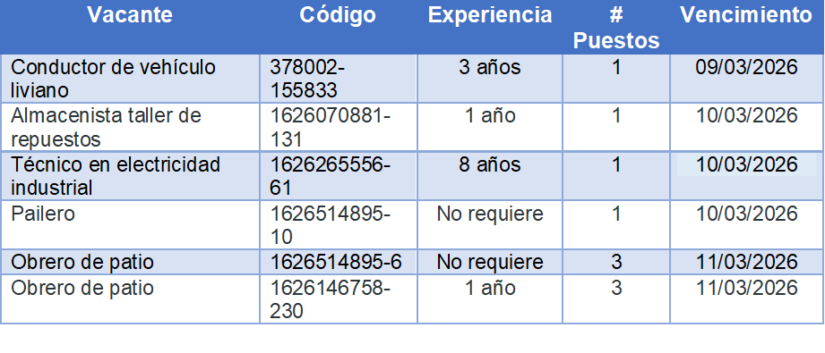 Entre las opciones disponibles se encuentran cargos para conductores de vehículos livianos, almacenistas, técnicos en electricidad industrial, paileros y obreros de patio, algunos de ellos sin requisito de experiencia, lo que amplía las posibilidades para quienes buscan su primer empleo o desean mejorar su situación laboral.