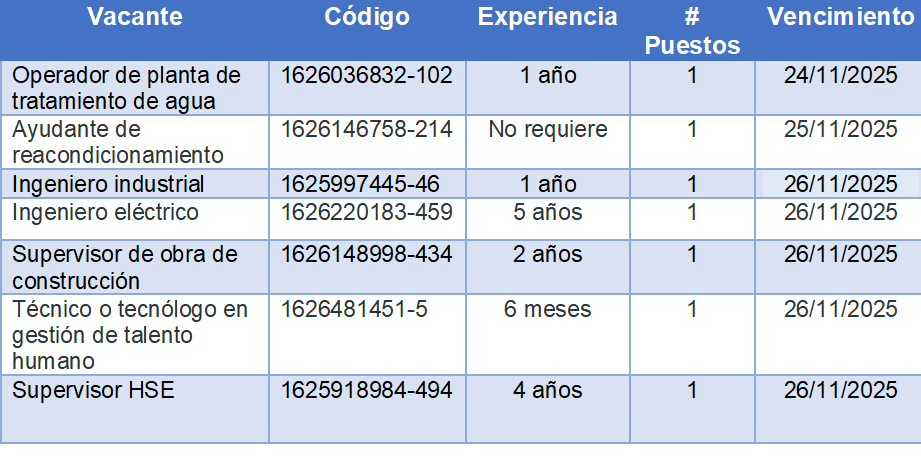 Ingeniero industrial, ayudante de reacondicionamiento, ingeniero eléctrico, supervisor de obra y operador de planta de tratamiento de agua, son algunas de las vacantes ofertadas por las empresas de Villavicencio para esta semana a través de la Agencia Pública de Empleo de la Alcaldía.