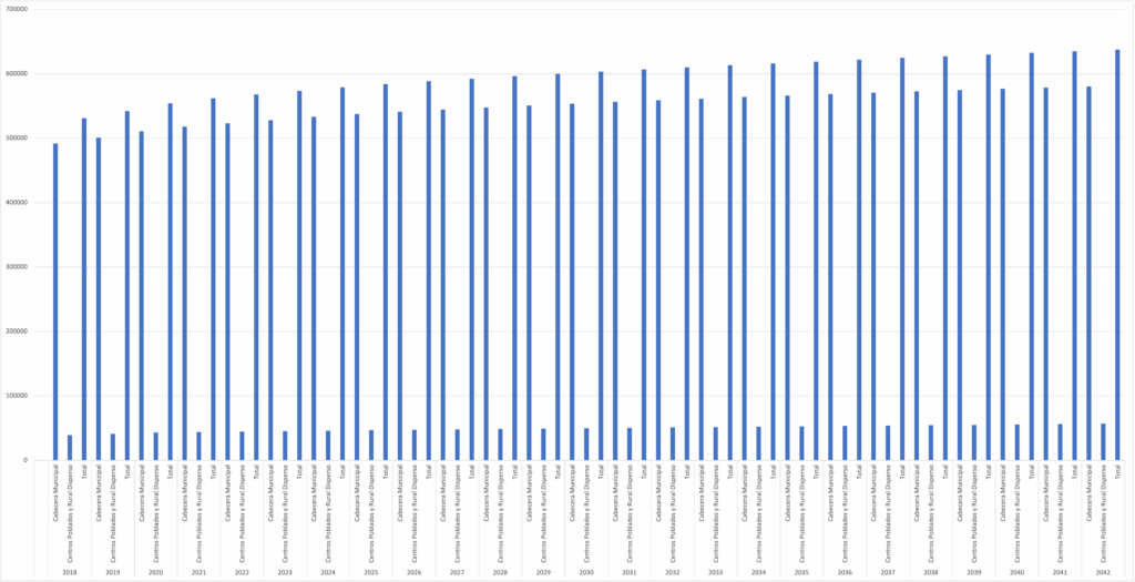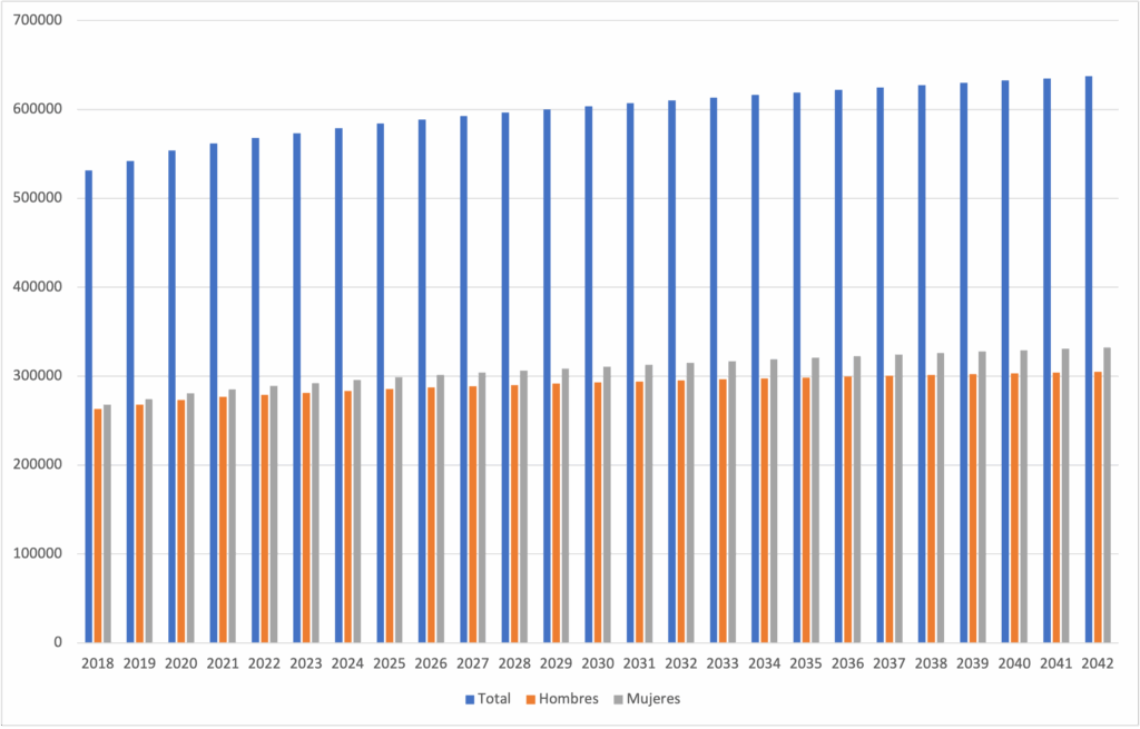 NOTA: Como se observa en la gráfica de proyección de población por sexo, a lo largo de los años ha venido incrementando la diferencia entre mujeres y hombres, puesto que en año 2018 la diferencia era de aproximadamente el 0,88% y para el 2042 se proyecta una diferencia del 4,30% mayor la cantidad de mujeres respecto a los hombres.