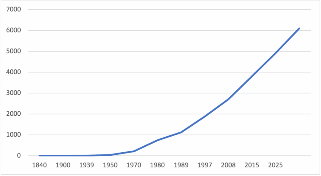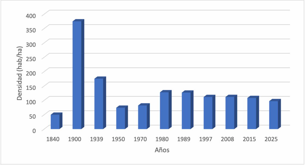NOTA: Como se observa en la gráfica el año en el cual se presentó mayor densidad de la huella urbana fue en 1900; mostrando un comportamiento descendiente hasta 1950, año a partir del cual presenta un crecimiento moderado hasta 1989 y posteriormente hasta el año 2025 presenta un disminución.